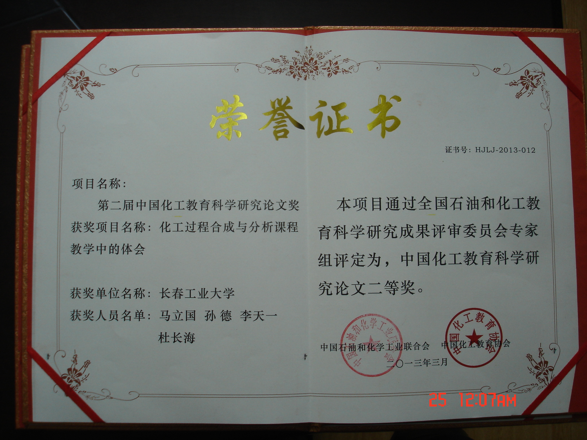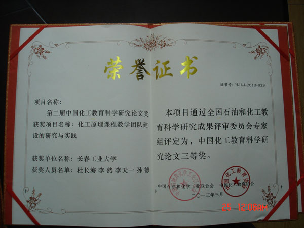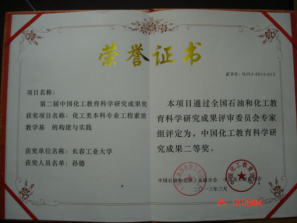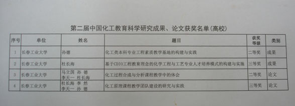 共有2项教学成果荣获化工教育科学研究成果奖,2篇论文荣获化工教育科学研究论文奖。