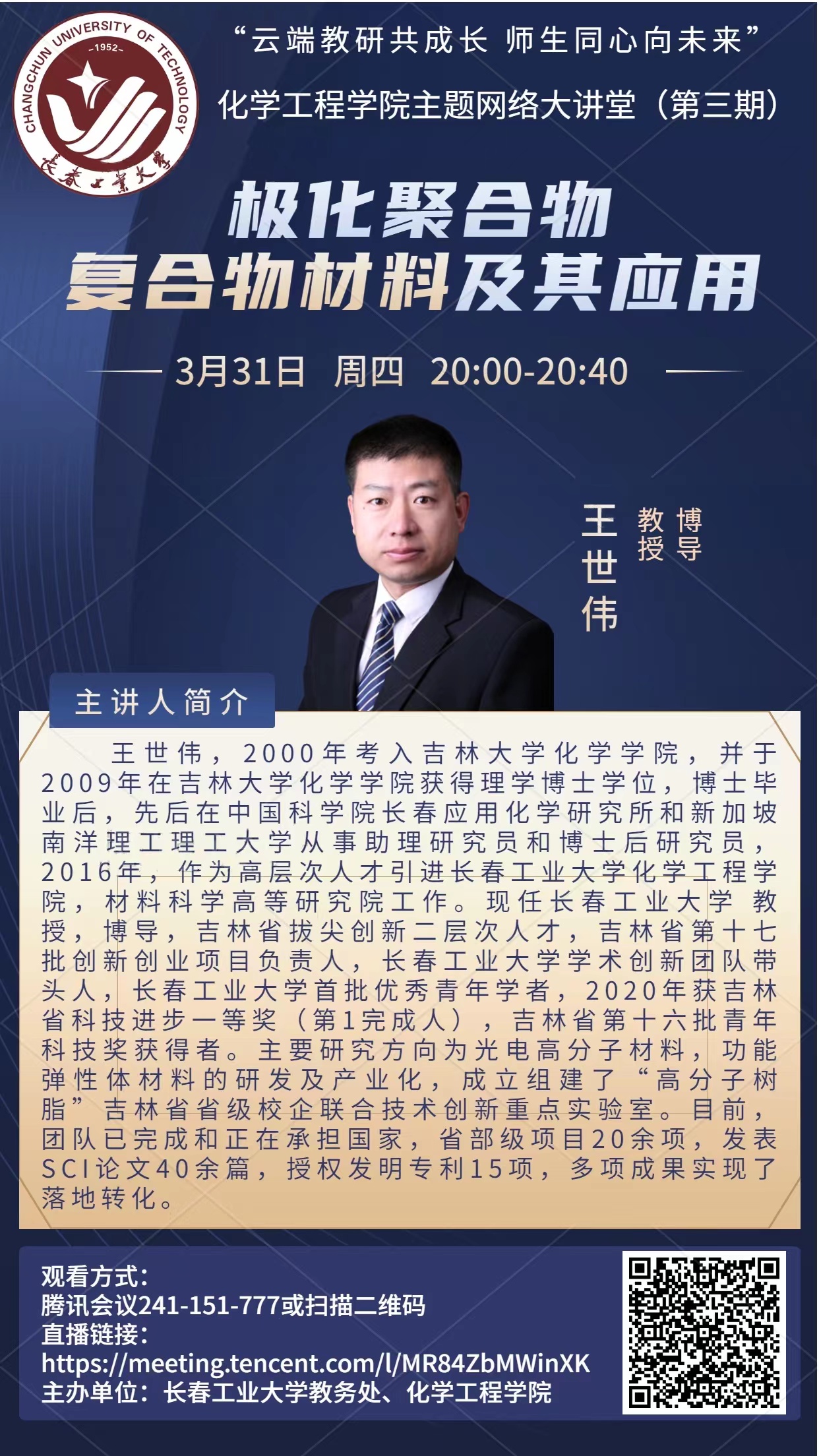 为增强战胜疫情的信心,缓解学生的焦虑情绪,丰富学术和文化生活,由教务处和808钱包官网 主办,面向在校本科生和研究生推出“云端教研共成长 师生同心向未来”808钱包官网 主题网络大讲堂系列活动。每期邀请一位主讲嘉宾在腾讯会议线上进行报告(报告30分钟,讨论10分钟),以学术报告、教研讲座、思政讲座、科普讲座等形式与同学们深入交流,为同学们带来人文关怀与学术素养熏陶。第一期定于3月27日(星期日)晚18:00举行,第二期于3月29日(星期二)晚20:00举行,之后会陆续发布系列报告时间,具体信息见海报,欢迎大家观看直播。