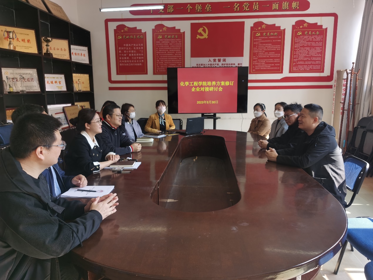 (通讯员:王璐)3月30日上午10时,为进一步做好化工学院各专业2022版人才培养方案的修订工作,院长高光辉、教学副院长李贞玉、各系主任与吉林省泽葳医疗器械股份有限公司技术开发部经理郑子龙、产品部经理张广有共同召开座谈会,就2022版专业人才培养方案修订、课程建设等问题进行了深入研讨,充分了解企业需求。