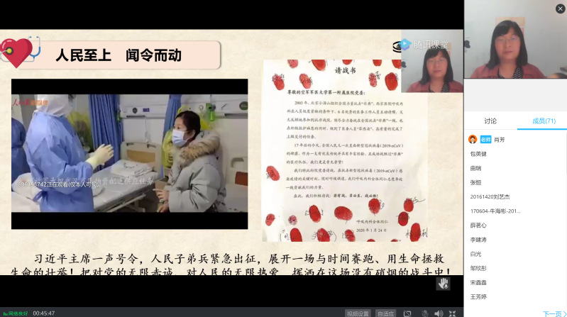 党课学习中,肖芳还与支部党员分享了疫情期间一批批90后党员冲在一线、战在一线,让党旗在防控疫情斗争第一线高高飘扬的感人故事,勉励支部党员牢记党员身份,加强理论学习提升思想认识,充分发挥学生党员的先锋模范作用,做战“疫”的守护者、修行者、识途者,用责任担当践行初心使命。