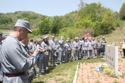 第四站开展“重走抗联路”现场教学,在抗联队长的带领下来到花山镇珍珠门八里沟子山脚下,党员们身着军装,一路上经过了当年抗联战士们设立的狙击机枪点,在这里仿佛看到了抗联战士们英勇无畏的浴血奋战的情景;接着来到康营长牺牲地,党员们向康营长墓碑三鞠躬表达内心的敬意;最后,来到了抗战密营,环境十分潮湿,现场人员感叹环境的艰苦。在行进中登上山峰之巅,看到了雪村春夏美景,不禁令人感叹,今天的美好生活都是革命先烈们用热血生命换来的!
