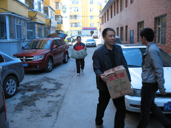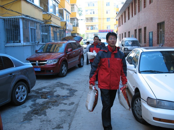 化工学院党委书记夏天民、党支部书记代表冼远芳、党员代表吴广峰、孙树林、孙林平、胡江磊、米浩宇和学生代表带着慰问品来到东田社区。活动现场,夏书记代表化工学院党委将慰问品大米、白面和豆油送到东田社区,分发到十户特困户中。