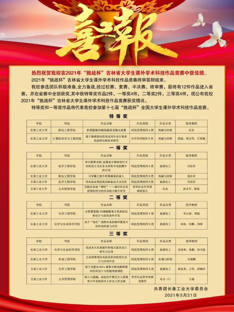 祝贺学院在2021年“挑战杯”吉林省大学生课外学术科技作品竞赛中获佳绩
