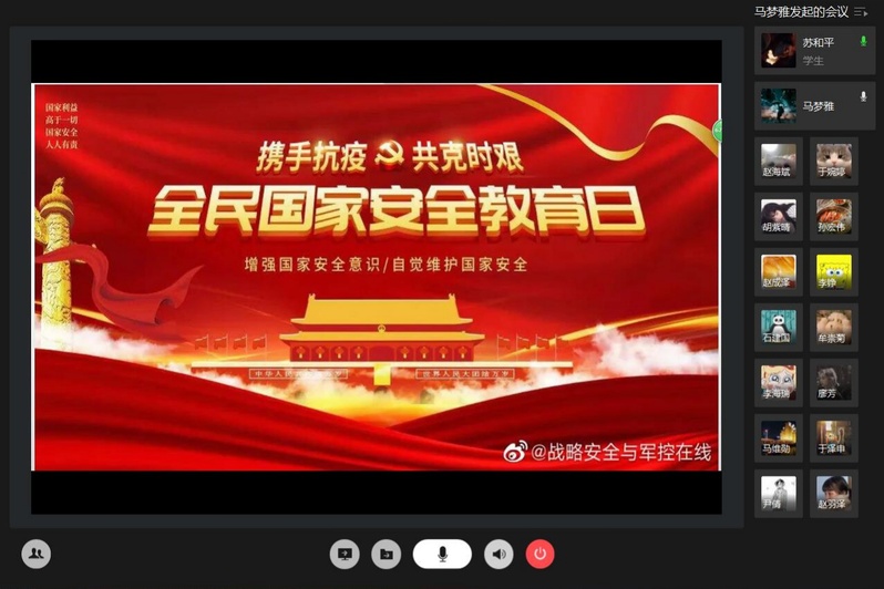 新闻网讯(通讯员廖芳 刘雨婷)为提高同学们自觉维护国家安全意识,180608团支部于4月15日晚8点半举行“增强国家安全意识,自觉维护国家安全”线上主题团课,此次团课由团支部书记马梦雅主持,团支部全体成员参加。