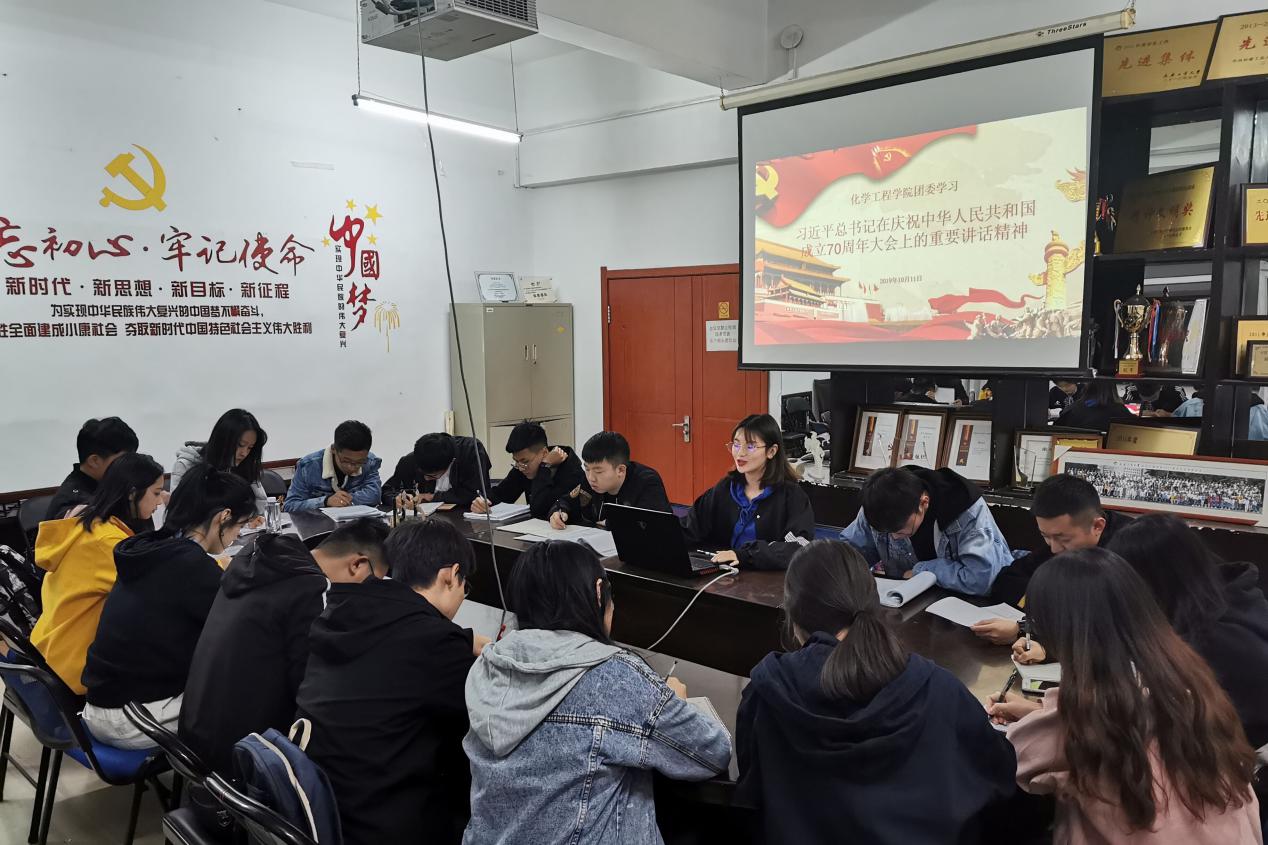 团委11日在南湖校区化工楼四楼会议室组织学院团委成员学习习近平总书记在庆祝中华人民共和国成立70周年大会上的重要讲话精神。学习会由学院团委组织部副部长刘香池主持。