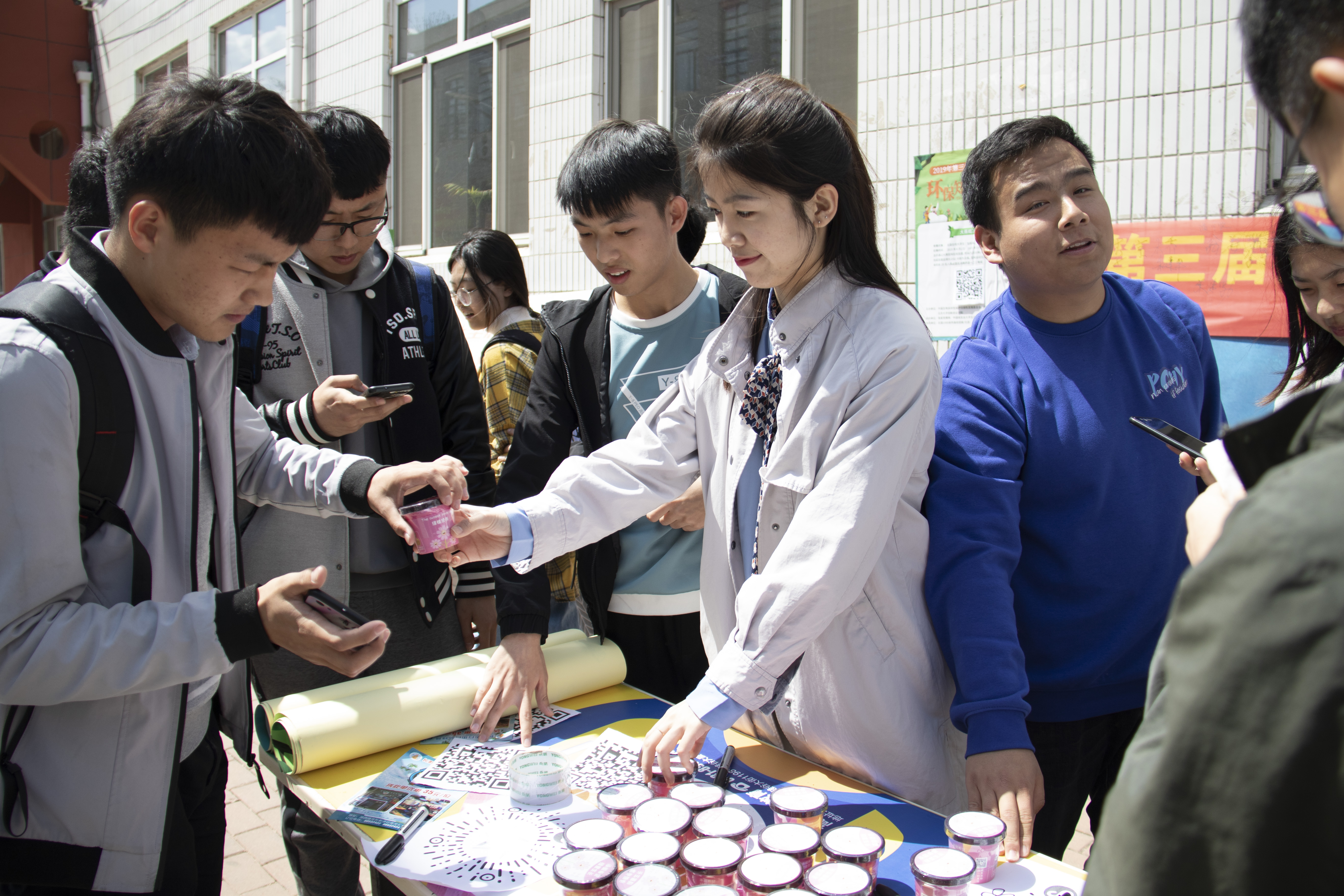 活动中,志愿者通过制作问卷二维码,让大家通过手机参与在线的环保意识问卷调查,这引起现场很多同学的兴趣,很快人气爆满。随后,姚玉琳同学向现场的同学们宣传目前我国的环境污染问题和保护环境维持生态平衡的措施。志愿者们同时向参加活动的同学发放领养绿植,绿植中含有多重元素的土壤,可以在里面播种小小的植物。志愿者希望每个人都能从自己开始为大自然增添一抹绿意。最后,宣传活动在二百余人在保护环境宣传条幅上签字承诺中结束。