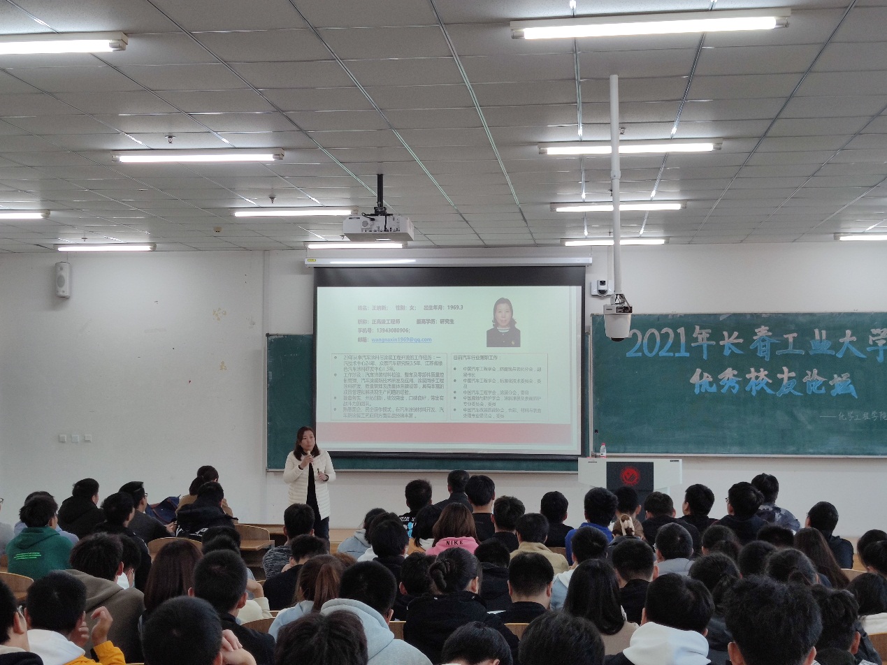 王纳新为同学作了题为“我国汽车涂料的发展与涂装技术的进步”的学术报告。她主要围绕中国汽车涂料发展的历史、发展的现状、汽车行业大变革时期涂装技术应对以及汽车新材料开发及应用的管控方法四个大方面展开。报告结束后,同学们就将来的就业方向、毕业考研、人生规划等问题与王纳新进行了交流互动。通过聆听报告和交流互动,同学们开阔了眼界,启发了思维,受到了鼓舞,达到了预期效果。