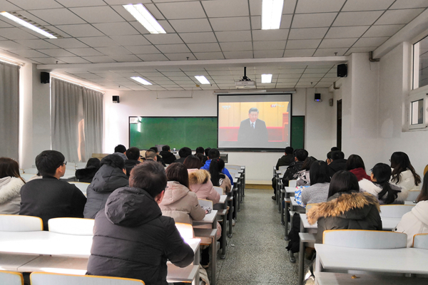 党委组织学院党员在科研楼302教室收看了中央电视台直播的大会实况。