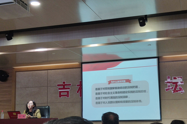讲座上,石瑛教授首先带大家回顾了党的十一届三中全会的历史背景和关键性的历史事件,将党的十一届三中全会比喻为那个时期响彻中华大地的“春雷”,真实形象的展示出这次会议对我们党和国家的命运带来的深远影响。随后,石教授讲述了改革开放四十年中国特色社会主义事业的伟大飞跃, “改革开放是党的一次伟大觉醒,正是这个伟大觉醒孕育了党从理论到实践的伟大创造”。最后,石教授用大事记的方式详细的向大家展示了这四十年来中国的进步与发展。40年来,我们始终坚持中国特色社会主义政治发展道路;40年来,我们始终坚持推进祖国和平统一大业;40年来,我们始终坚持加强和改善党的领导。
